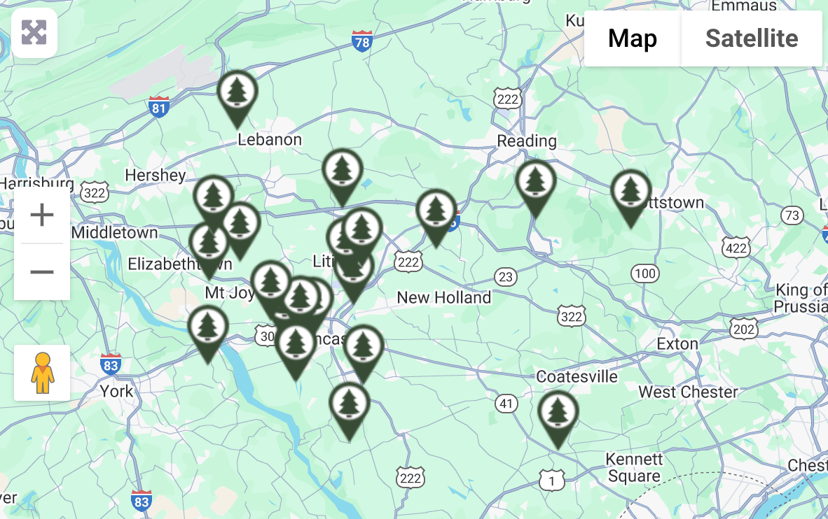 Not sure where to go? We’ve created an interactive Lancaster tree farm map so you can find a Christmas tree farm near you. We don’t claim this to be an exhaustive list, but we did our best to find as many good choices as possible. Did we miss your favorite? Send us an email, and we’ll be happy to add it to the list.